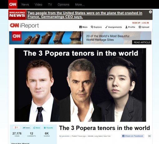 미국 뉴스전문 채널 CNN의 오피니언 뉴스사이트인 CNNiReport는 25일(현지시간) 영국의 러셀 왓슨, 이탈리아의 알렉산드로 사피나와 함께 임형주를 ‘세계 3대 팝페라 테너’(The 3 Popera Tenors in the World)로 꼽았다.