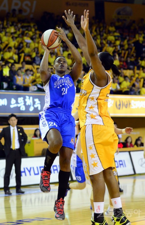 26일 오후 청주실내체육관에서 열린 ‘2014~2015 KB국민은행 여자 프로농구’ 챔피언결정전 3차전 청주 KB스타즈와 춘천 우리은행의 경기에서 우리은행 휴스턴이 KB스타즈 스트릭렌의 수비를 피해 슛을 하고 있다.