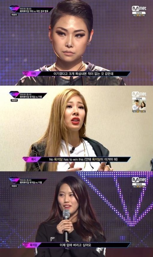 한편 ‘언프리티 랩스타’는 여자 래퍼 컴필레이션 앨범 제작을 놓고 8인의 실력파 여자 래퍼들이 치열한 대결을 펼치는 서바이벌 프로그램. 제시·지민·타이미·치타·졸리브이·키썸·육지담·릴샴·제이스 등이 출연했다.