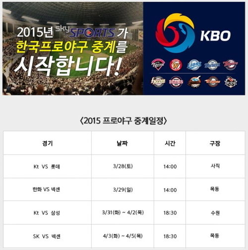 한편, 스카이스포츠는 오는 28일 오후 2시 kt와 롯데의 시즌 개막전을 중계한다. 29일에는 한화-넥센 전을, 31일부터는 삼성-kt전, 4월3일부터는 SK-넥센 전 생중계를 이어간다.