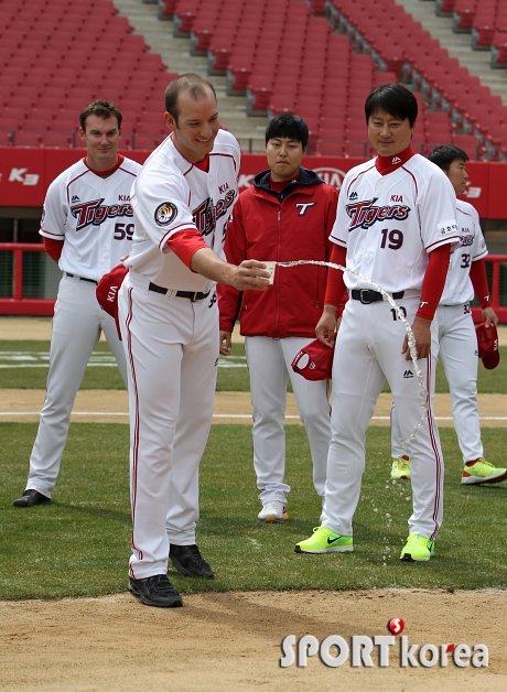 마운드에 술 뿌리는 스틴슨 ‘어색하네요~’