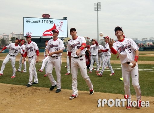 28일 오후 광주-기아 챔피언스 필드에서 열린 ‘2015 타이어뱅크 KBO 리그 프로야구’ 페넌트레이스 KIA 타이거즈와 LG 트윈스의 개막전 공식행사에서 KIA의 강한울 등 선수들이 사인볼을 관중석으로 던지고 있다. 전국 5개 구장에서 일제히 개막전을 가지며 대장정에 돌입한 프로야구는 신생 구단 kt가 합세해 팀당 144경기로 총 720경기를 펼치게 된다.