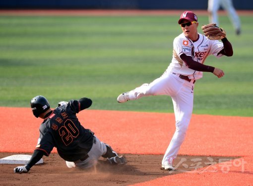 6회초 무사 1루에서 한화 고동진의 내야땅볼 때 1루주자 정범모가 2루에서 넥센 김하성에게 포스아웃되고 있다.