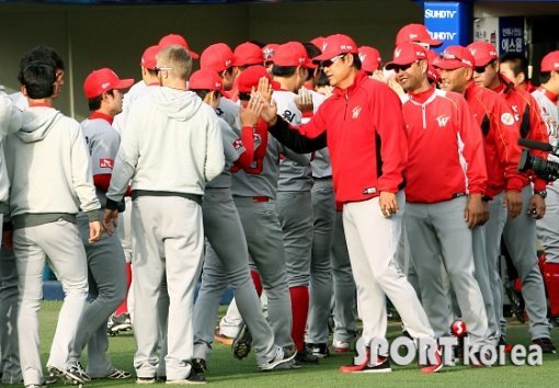 경기종료 후 SK 김용희 감독이 선수들과 그라운드 위에서 승리의 기쁨을 나누고 있다.