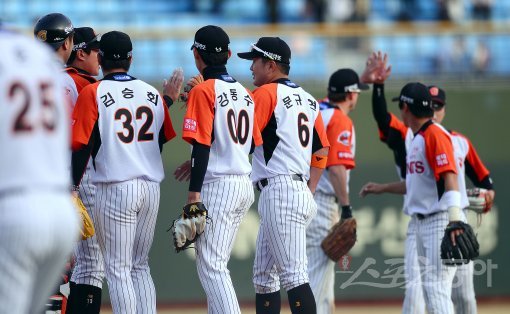 5-4로 승리하며 개막 2연전을 모두 승리한 롯데 선수들이 하이파이브 하고 있다.