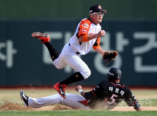롯데 유격수 문규현(위)이 29일 사직 kt전 6회초 김상현의 내야 땅볼 때 1루주자 앤디 마르테를 포스아웃시킨 뒤 1루로 볼을 뿌리며 공을 쫓고 있다. 사직|김종원 기자 won@donga.com