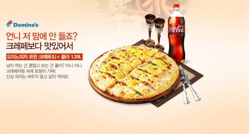 해당 이미지에는 “언니 저 맘에 안 들죠? 크레페보다 맛있어서… 남이 먹는 건 괜찮고 보는 건 좋아? 아니 아니… 신상피자는 싸우지 말고 같이 먹어요”라는 글이 적혀있다.