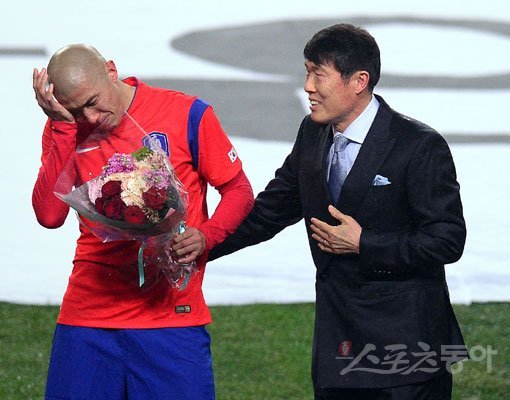 차 전 감독은 31일 부인 오은미 씨와 함께 아들의 은퇴경기가 펼쳐진 서울월드컵경기장을 또 찾았다. 아들이 대표팀 유니폼을 입고 그라운드를 누비는 모습을 더 이상은 직접 볼 수 없었기에 차 전 감독의 시선은 경기장에 고정됐다. 하프타임에 아들의 은퇴식을 지켜보면서 눈시울을 붉혔다.