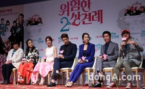 배우 김도연, 박은혜, 진세연, 홍종현, 전수경, 신정근, 감독 김진영(왼쪽부터)이 1일 오전 서울 롯데시네마 광진구 건대입구에서 열린 영화 위험한 상견례2 제작발표회에 참석하고 있다. 코미디 영화 '위험한 상견례2' 는 30일 개봉 예정.