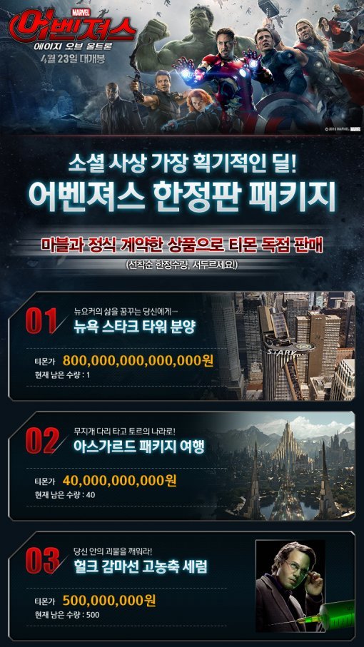‘어벤져스: 에이지 오브 울트론’ 측은 1알 어벤져스 한정판 패키지 8종 판매 이벤트를 개시했다. 이는 4월 1일 만우절을 맞아 소셜커머스 사이트인 티켓몬스터와 협업을 통해 내놓은 깜짝 이벤트.