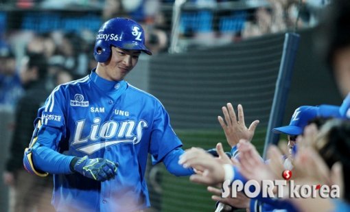 1일 오후 수원 케이티 위즈파크에서 열린 ‘2015 타이어뱅크 KBO리그’ 프로야구 kt 위즈 대 삼성 라이온즈의 경기 6회초 1사에서 삼성 구자욱이 kt 정대현을 상대로 시즌 첫 홈런을 쳐 홈을 밟은 후 덕아웃 동료선수들의 환영을 받고 있다.