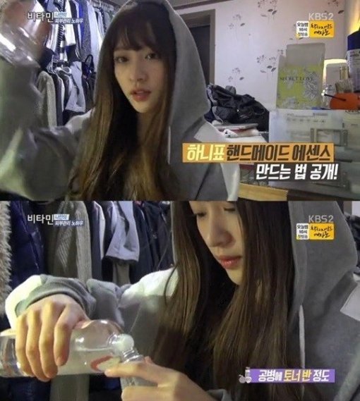 이날 방송에서 하니는 셀프 카메라를 통해 자신이 사용하는 핸드메이드 에센스를 공개했다.