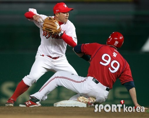 2일 오후 인천 문학야구장에서 열린 ‘2015 타이어뱅크 KBO 리그 프로야구’ SK 와이번스와 KIA 타이거즈의 경기 KIA 4회초 무사 1루에서 5번 최희섭의 내야땅볼 때 SK 유격수 박진만이 1루주자 필을 2루에서 포스아웃 시킨 뒤 1루로 송구 더블플레이를 하고 있다.