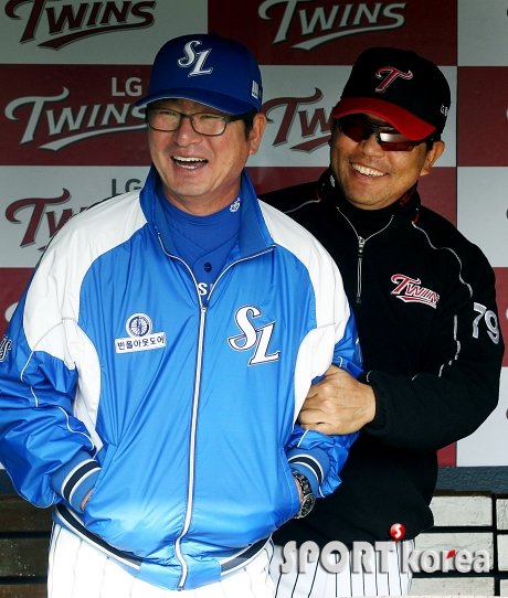 3일 오후 서울 잠실야구장에서 열리는 ‘2015 타이어뱅크 KBO리그’ LG 트윈스 대 삼성 라이온즈의 경기에 앞서 만난 삼성 류중일 감독과 LG 양상문 감독이 미소를 짓고 있다.