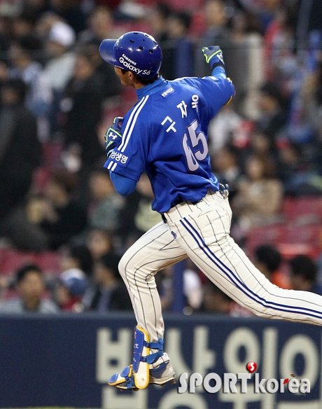 3일 오후 서울 잠실야구장에서 열린 ‘2015 타이어뱅크 KBO리그’ LG 트윈스 대 삼성 라이온즈의 경기 2회초 1사 1루에서 삼성 구자욱이 LG 소사를 상대로 선제 투런홈런을 친 후 그라운드를 돌며 환호하고 있다.
