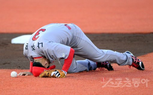 3일 오후 목동야구장에서 열린 ‘2015 타이어뱅크 KBO리그’ 넥센 히어로즈와 SK 와이번스의 경기에서 1회말 선두타자 서건창의 타구를 수비하던 SK 와이번스 나주환이 부상을 당한 뒤 고통스러워 하고 있다.