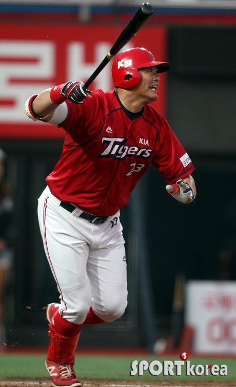 3일 오후 수원 kt위즈파크에서 열린 ‘2015 타이어뱅크 KBO 리그 프로야구’ kt 위즈와 KIA 타이거즈의 경기에서 KIA 5번 최희섭이 2회초 1사 후 kt 선발 어윈의 3구째를 통타 비거리125미터의 중월 솔로홈런을 치고 있다.