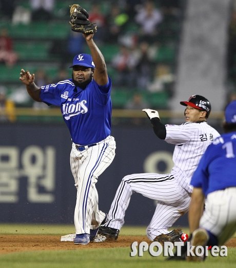 3일 오후 서울 잠실야구장에서 열린 ‘2015 타이어뱅크 KBO리그’ LG 트윈스 대 삼성 라이온즈의 경기 5회말 무사 1루에서 LG 최경철의 내야안타 때 1루주자 김용의가 2루에서 세이프되고 있다.