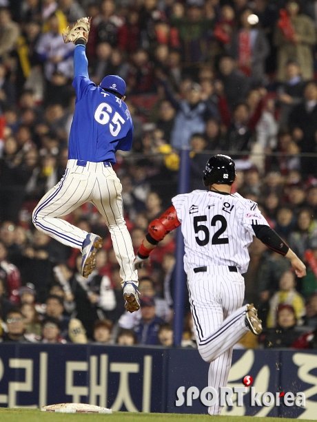 3일 오후 서울 잠실야구장에서 열린 ‘2015 타이어뱅크 KBO리그’ LG 트윈스 대 삼성 라이온즈의 경기 7회말 무사 2루에서 LG 손주인의 내야땅볼을 삼성 3루수 박석민으로부터 토스받기 위해 1루수 구자욱이 점프했으나 볼은 그 위로 지나가고 있다.