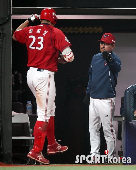 3일 오후 수원 kt위즈파크에서 열린 ‘2015 타이어뱅크 KBO 리그 프로야구’ kt 위즈와 KIA 타이거즈의 경기에서 KIA 최희섭이 8회초 1사 1루에서 우중월 투런홈런을 치고 홈인한 뒤 덕아웃에서 김기태 감독의 격려를 받고 있다.