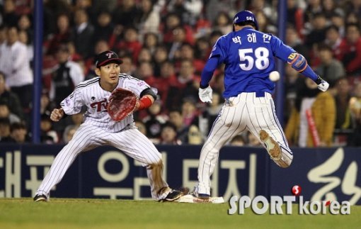 3일 오후 서울 잠실야구장에서 열린 ‘2015 타이어뱅크 KBO리그’ LG 트윈스 대 삼성 라이온즈의 경기 연장 10회초 무사 1루에서 삼성 박해민이 기습번트로 1루를 밟고 있다.