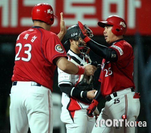 4일 오후 수원 kt위즈파크에서 열린 ‘2015 타이어뱅크 KBO 리그 프로야구’ kt 위즈와 KIA 타이거즈의 경기에서 KIA 6번 이범호가 9회초 무사 만루에서 비거리 130미터 중월 만루홈런을 날리고 홈인하며 최희섭과 하이파이브를 나누고 있다.