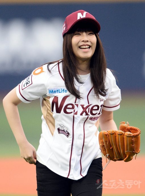 5일 오후 목동야구장에서 열린 ‘2015 타이어뱅크 KBO리그’ 넥센 히어로즈와 SK 와이번스의 경기에서 가수 주니엘이 시구를 한 뒤 환하게 웃고 있다.