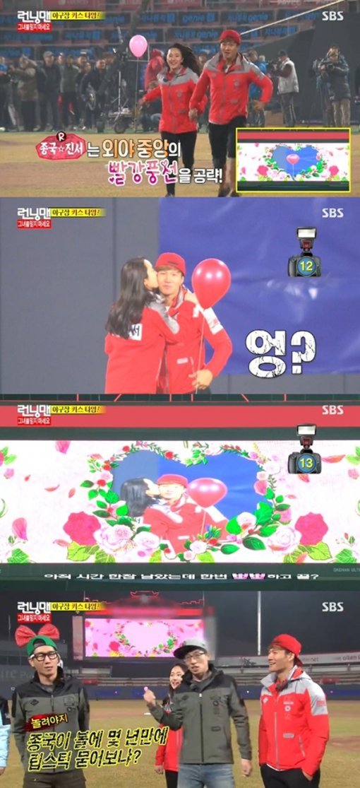 이날 ‘런닝맨’ 세 번째 게임으로 야구장 키스 타임을 활용, 커플 뽀뽀하는 장면이 하트 전광판 안에 정확히 찍히는 게임을 펼쳤다.