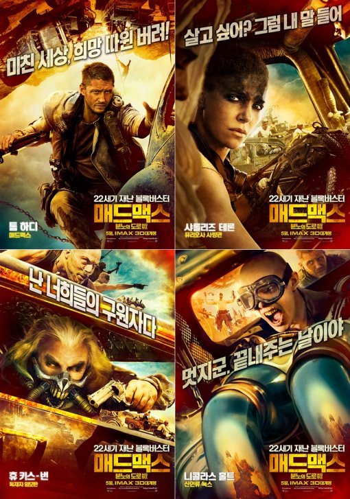 6일 공개된 4종 캐릭터 포스터는 사건을 이끌어가는 주요 인물들의 모습을 역동적인 이미지로 담았다. 멜 깁슨에 이어 새로운 ‘맥스’로 등장하는 톰 하디는 “미친 세상, 희망 따윈 버려!”라는 문구처럼 과거의 아픔을 겪고 오로지 살아남는 것이 목적인 로드 워리어의 모습에서 ‘다크 나이트 라이즈’와 ‘인셉션’에서 보여주었던 특유의 과묵함과 남성적인 매력을 과시한다.