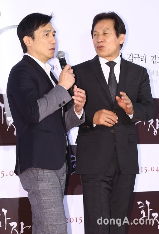 배우 양조위(왼쪽), 안성기가 6일 오후 서울시 광진구 건대입구 롯데시네마에서 열린 영화 ‘화장’VIP시사회에 참석해 포토타임을 하고 있다.