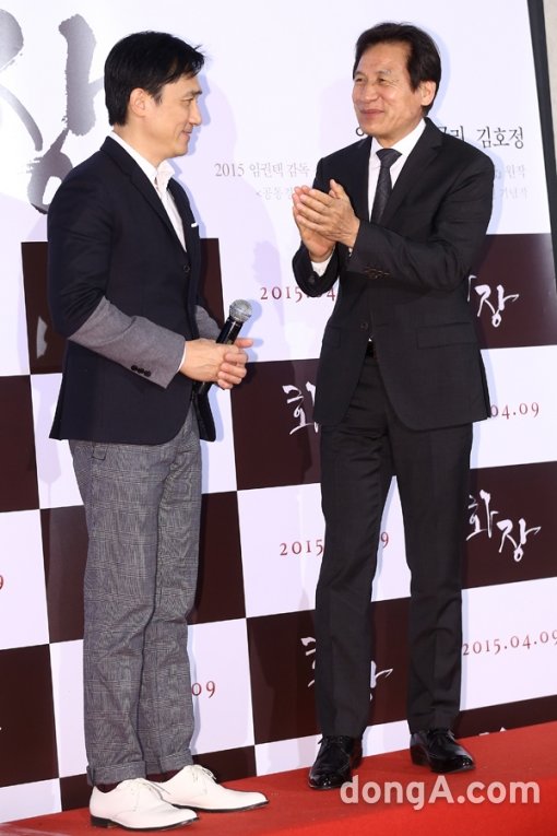 배우 양조위(왼쪽), 안성기가 6일 오후 서울시 광진구 건대입구 롯데시네마에서 열린 영화 ‘화장’VIP시사회에 참석해 포토타임을 하고 있다.