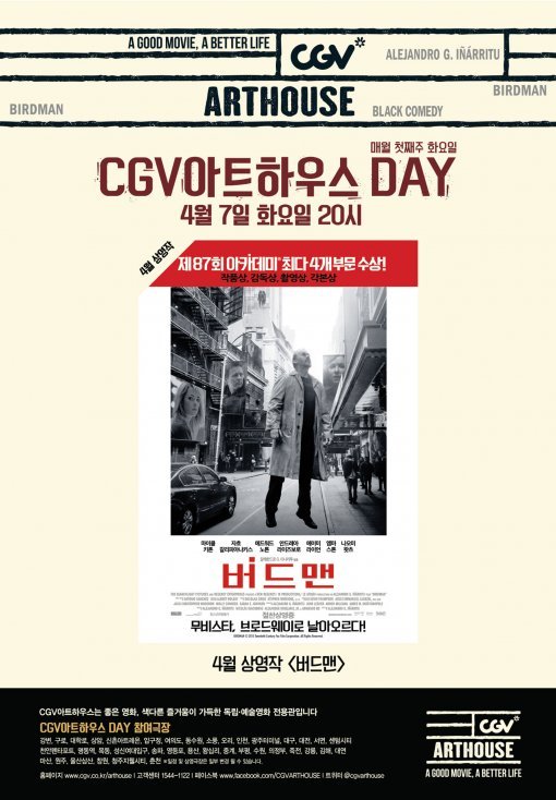 ‘CGV아트하우스 DAY’는 매 월 첫째주 화요일 CGV아트하우스가 엄선한 독립∙예술영화를 일반 상영관까지 확대 상영하는 행사. ‘버드맨’은 오는 4월 7일(화) 저녁 8시 CGV 강변, 구로, 대학로, 상암, 신촌아트레온, 압구정, 여의도, 인천, 죽전, 원주, 중계 등 전국 CGV 38개 극장에서 관객들을 만난다.