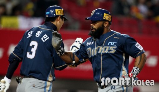 7일 오후 광주-기아 챔피언스 필드에서 열리는 ‘2015 타이어뱅크 KBO 리그 프로야구’ KIA 타이거즈 대 NC 다이노스 경기 4회초 NC 선두타자 테임즈가 KIA 선발 스틴슨을 상대로 솔로홈런을 쳐 홈을 밟은 후 대기타석 모창민의 환영을 받고 있다.