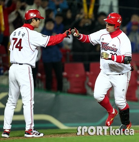 7일 오후 광주-기아 챔피언스 필드에서 열리는 ‘2015 타이어뱅크 KBO 리그 프로야구’ KIA 타이거즈 대 NC 다이노스 경기 4회말 1사에서 KIA 나지완이 NC 선발 해커를 상대로 동점 솔로홈런을 친 후 그라운드를 돌며 김종국 3루코치의 환영을 받고 있다.