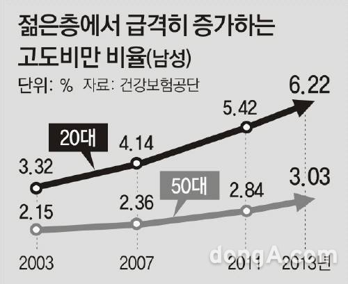 1980년부터 2013년까지 연령별로 보면 20세 이상 남성의 과체중 비율은 23%에서 36%로 늘었다. 같은 기간 20세 미만 남성의 증가율이 23%로 나타났고, 20세 이상과 미만인 여성이 각각 3%와 12% 증가한 것을 보면 성인 남성의 영양 과잉이 그만큼 심각하다는 의미다.