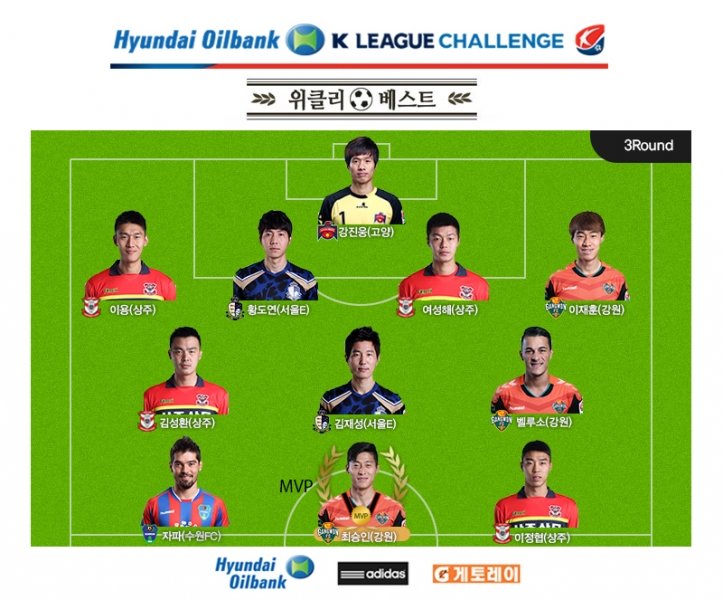 미드필더 부문에는 벨루소(강원) 김재성(서울 이랜드) 김성환(상주)이 이름을 올렸으며 수비수는 이재훈(강원) 여성해(상주) 황도연(서울 이랜드) 이용(상주)이 선정됐고 강진웅(고양)이 K리그 챌린지 3라운드 최고의 골키퍼로 꼽혔다.