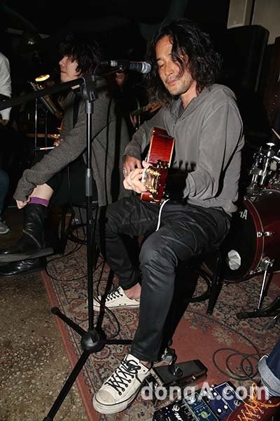 배우 겸 가수 최민수가 8일 오후 서울 마포구 합정동의 한 바에서 36.5˚C의 신곡 말하는 개 발표 기념 기자간담회에서 공연을 펼치고 있다.