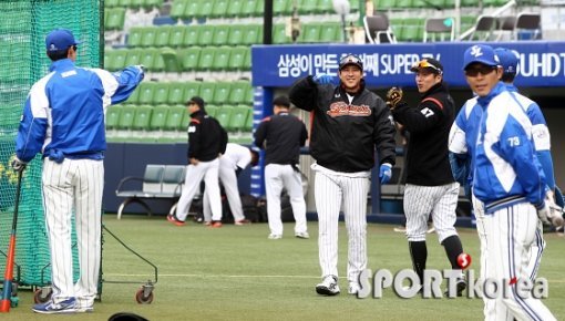 8일 오후 대구 시민야구장에서 열린 ‘2015 타이어뱅크 KBO 리그’ 삼성 라이온즈와 롯데 자이언츠의 경기에 앞서 롯데 황재균, 강민호가 삼성 덕아웃을 향해 인사를 하고 있다.