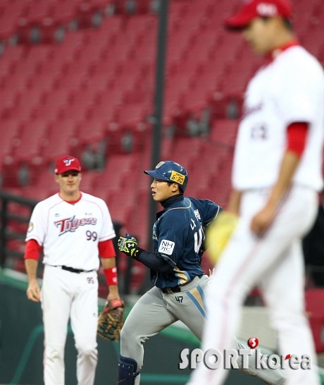8일 오후 광주-기아 챔피언스 필드에서 열린 ‘2015 타이어뱅크 KBO 리그 프로야구’ KIA 타이거즈 대 NC 다이노스 경기 1회초 1사 2루에서 NC 나성범이 KIA 선발 임기준을 상대로 좌월 투런홈런을 친 후 그라운드를 돌고 있다.