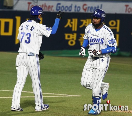 8일 오후 대구 시민야구장에서 열린 ‘2015 타이어뱅크 KBO 리그’ 삼성 라이온즈와 롯데 자이언츠의 경기 3회말 1,3루에서 삼성 나바로가 좌월 3점포를 쏘아올린 후 그라운드를 돌고 있다.