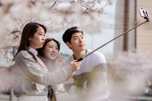 서울 여의도에서 봄꽃놀이 어때요? 서울 여의도 63빌딩 주변에서 화사한 벚꽃을 배경으로 셀카 사진을 찍고 있는 사람들. 사진제공|63스퀘어