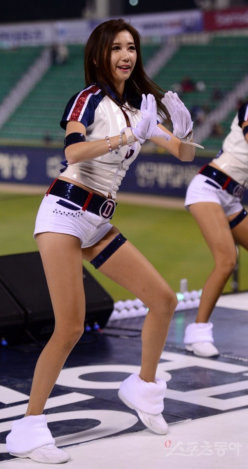 두산 치어리더가 흥겨운 춤을 추며 응원을 하고 있다.