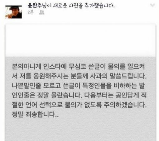 윤완주는 “본의아니게 인스타에 무심코 쓴 글이 물의를 일으켜 저를 응원해주는 분들께 사과의 말씀을 드립니다”라며 “나쁜 말인 줄 모르고 쓴 글이 특정 인물을 비하하는 발언인 줄은 정말 몰랐습니다”고 사과했다.