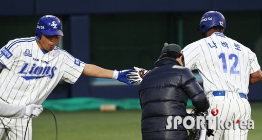 9일 오후 대구 시민야구장에서 열린 ‘2015 타이어뱅크 KBO 리그’ 삼성 라이온즈와 롯데 자이언츠의 경기 1회말 무사에서 삼성 나바로가 좌중간을 넘기는 솔로포를 쏘아린 후 대기타석 박한이와 하이파이브를 하고 있다.