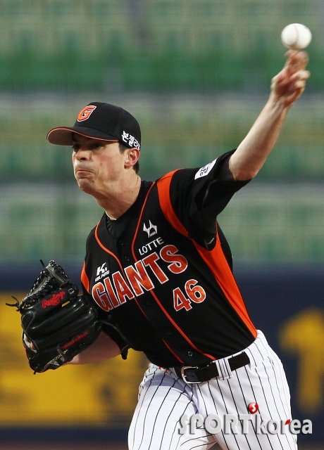 9일 오후 대구 시민야구장에서 열린 ‘72015 타이어뱅크 KBO 리그’ 삼성 라이온즈와 롯데 자이언츠의 경기 1회말에서 롯데 선발투수 레일리가 역투하고 있다.