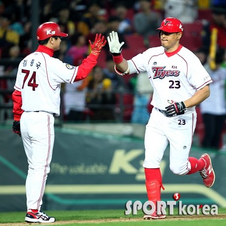 9일 오후 광주-기아 챔피언스 필드에서 열린 ‘2015 타이어뱅크 KBO 리그 프로야구’ KIA 타이거즈 대 NC 다이노스 경기 2회말 KIA 선두타자 최희섭이 우월솔로홈런을 친 후 그라운드를 돌며 김종국 1루코치의 환영을 받고 있다.