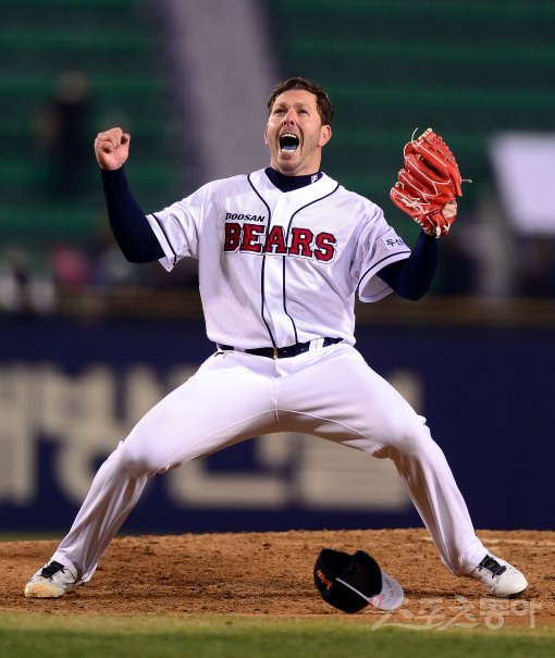 선발 투수로 등판한 두산 마야가 9회초 2사 2루 넥센 유한준을 삼진 아웃시키며 노히트노런을 기록한 후 환호하고 있다.