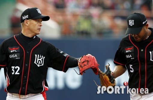 11일 오후 서울 목동야구장에서 열린 ‘2015 타이어뱅크 KBO 리그’ 넥센 히어로즈와 kt 위즈의 경기에서 kt 선발투수 옥스프링이 4회말을 2K 삼자범퇴 처리하고 마르테와 하이파이브를 하고 있다.