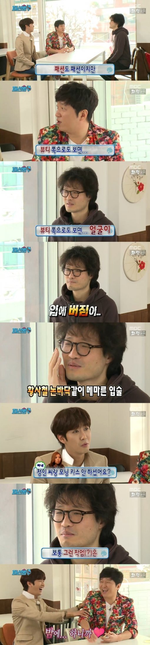 정형돈은 “패션도 패션이지만 뷰티 쪽으로도 얼굴이 문제”라며 “입에 버짐이 퍼졌다. 건조해 보인다”고 지적했고 광희는 “정인 선배님하고 모닝 키스는 안 하셨냐”고 물었다.