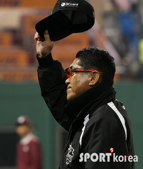 경기종료 후 시즌 11연패를 끊고 창단 첫 승을 거둔 kt 조범현 감독이 팬들에게 인사를 하고 있다.